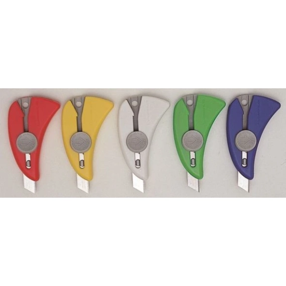 Enkel kartongkniv med knivblad som kan gjemmes i plasthåndtaket for sikker oppbevaring. Fås i assorterte farger: rød, gul, hvit, grønn og blå. Praktisk hull i plastdelen for å feste snor. Knivblad i spesialherdet japansk stål.