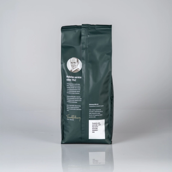 Mild brenning og mild syrlighet gir en balansert kaffe med distinkte smaker. Tydelig og behangelig ettersmak.45% Arabica bønner.