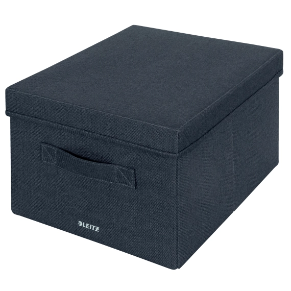 Føl deg hjemme uansett hvor dagen din tar deg med Fabric-serien fra Leitz. Med dens minimalistiske design og innbydende mattgrå fløyelsfinish kan du holde deg organisert både hjemme og på kontoret. Leitz Fabric oppbevaringsbokser er ideelle for å rydde vekk kontortilbehør som ladere og stiftemaskiner for å holde dem organisert og lett tilgjengelige. Hjemme kan oppbevaringsboksene brukes til å oppbevare fotografier og andre mindre gjenstander i hyller og skap. Laget av mykt materiale som er forsterket med resirkulert papp for styrke og holdbarhet. Totalt 57 % resirkulert innhold. Når de ikke er i bruk, er de fullstendig sammenleggbare slik at den enkelt kan oppbevares. Disse oppbevaringsboksene med håndtak er det perfekte tillegget til hjemmet eller kontoret for å sikre at du holder deg avslappet og produktiv hele dagen. - Medium sammenleggbare oppbevaringsbokser med lokk for å holde orden på ting i hjemmet og på kontoret - Designet for å holde dokumenter i opptil A4-størrelse, nettb