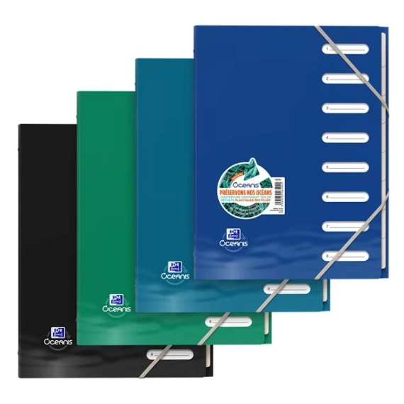 Vil du bidra til å bevare havene? Da bør du velge denne Oxford Oceanis-sorteringsmappen: Omslaget inneholder 30 % resirkulert plast fra brukte tau fra havindustrien. Ved å resirkulere disse tauene bidrar Oxford til å redusere mengden plastavfall som kastes i havet. Ved å bruke denne resirkulerte plasten bidrar Oxford også til å bevare fossile ressurser og redusere CO2-utslipp. Ved å produsere resirkulert plast, i stedet for ny plast, reduseres CO2-utslippene med 90 % I tillegg til å være mer miljøvennlig, er Oceanis A4 flerdelt fil praktisk. Den er utstyrt med 8 ugjennomsiktige inndelinger med nøytrale faner for å sortere og organisere dokumenter, samt en mappe med 3 klaffer bak til oppbevaring av dokumenter, eller til blanke ark eller ting (linjal, kalkulator, notatbok…). Omslaget har numerisk indeksering for bedre presentasjon og brukervennlighet. Innholdet er sikret med en flat strikk i beige.