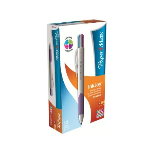 Denne inntrekkbare Paper Mate® InkJoy™ Quatro-kulepennen har fire forskjellige blekkfarger for klar, skarp og levende skrift. Denne inntrekkbare kulepennen er ideell for bruk på skolen eller jobben, og har fire forskjellige farger som kan brukes til å fargekode og utheve viktige punkter i dine skole- eller møtenotater. De fire store og runde knappene på hetten kan klikkes på eller av for å velge farge. Pennens slanke form, komfortable grep og InkJoy™-skrivesystem sikrer minimal anstrengelse av trykket på din del for enkel og ren skriving. Den store spissen på 1,0 mm kan trekkes inn slik det passer deg. I tillegg kan du feste denne Paper Mate®-pennen til lommer, notatbøker og permer med lommeklipsen. - Inntrekkbar kulepenn med flere farger - InkJoy™-skrivesystem som gir jevn skriving - Komfortabelt grep for enkel skriving - Slank kropp for enkel håndtering - Fire store og runde knapper på hetten for valg av farge - Stor 1,0 mm kulespiss - Farge: Blå, grønn, magenta, lilla - Pakke med 12