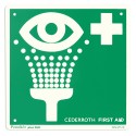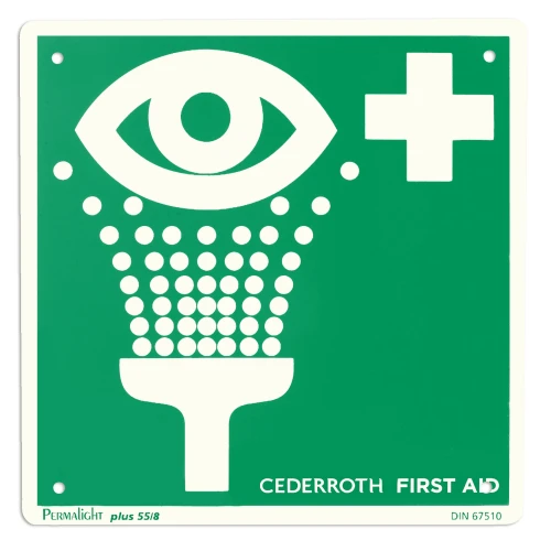 Green-yellow photoluminescent double sided sign for signaling where first aid equipment (eye wash) can be found. The photoluminescent afterglow remains up to 15 h after having been fully charged by light. The sign has holes in each rounded corner for screwing onto the wall. REF 1750 comes with an adhesive sign clip, which can be used for mounting of the sign pointing out from a wall or hanging down from the ceiling. Size: 20cm x 20cm