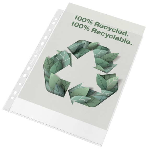Miljøvennlig A4 MAXI plastlomme for daglig bruk laget av ekstra sterk 100% resirkulert PP. Universal hullkant gir enkel lagring av dokumenterpermer. Hele produktet kan gjenbrukes og brukes om igjen. Kan inneholde flere A4 ark (opptil 80 ark) enn standard lommer. Lommene er pakket i en pappeske, som også er 100% resirkulert og resirkulerbar. Laget i Europa. Resirkulert innhold bekreftet av UL. - Beskyttende A4 MAXI plastlomme for lagring og arkivering av dokumenter. Større kapasitet med plass til magasiner og kataloger opp til 80 ark med A4-papirer. - Laget av 100% resirkulert giftfri plast (PP) og hele produktet er 100% resirkulerbar - Holdbar og langvarig premium kvalitet sikrer at de kan gjenbrukes gang på gang - 11-hulls universal forsterket hullkant for bruk i alle typer permer. Forsterkningen er laget av klar resirkulert folie - Format A4 med toppåpning, ideell for bruk på kontoret, hjemmekontoret eller skolen - Preget, matt overflate med førsteklasses folie i 100 mikron ty