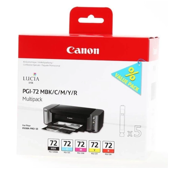Går blekket tomt? Sikre Canon Blekkpatron Pakke PGI-72 MBK/C/M/Y/R for din Pixma PRO-10 eller PRO-10 S. Spar på kvalitet nå! Varenummer 6402B009.