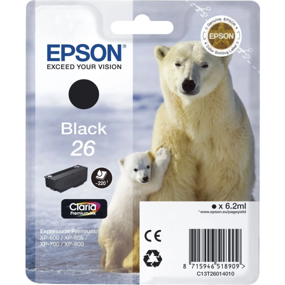 Oppgrader skriveren din med Epson Blekkpatron No.26 Sort. Kompatibel med XP-510, XP-520, XP-600, XP-605, XP-610, XP-615, XP-620, XP-625, XP-700, XP-710, XP-720, XP-800, XP-810, XP-820. Bestill nå!