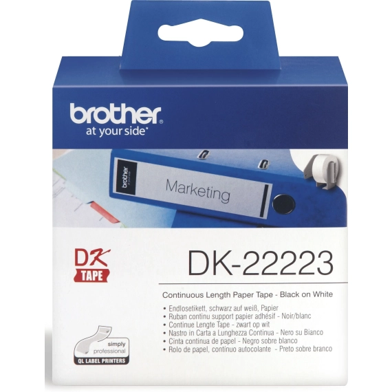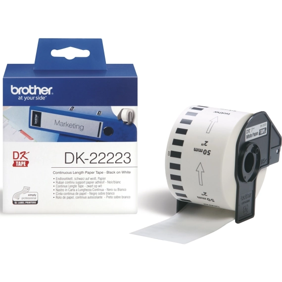 Sikre optimal etikettering med Brother Taperull DK-22223, sort på hvit, 50mm x 30.48m. Passer perfekt til P-Touch QL 1050 og QL 700. Se kompatible modeller.