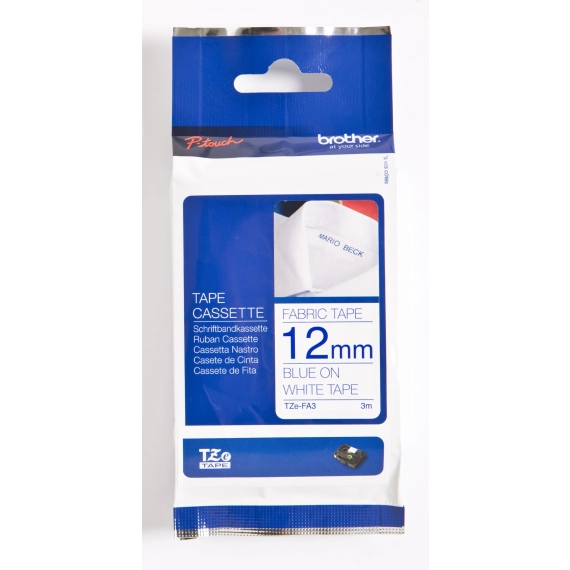Utforsk slitesterk Brother P-Touch Tape TZE-FA3, 12mm blå på hvit, for tydelig tekstilmerking. Passer til PT-P 900W, H 300, E 550W VP, D 450VP. Utforsk serien!