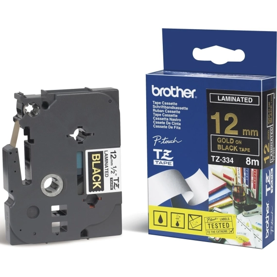 Utforsk Brother P-Touch Tape Gull på Sort 12mm, TZE-334 for P-Touch 1000, 1010, 1090, 1230 PC, E 100. Se kompatible modeller.