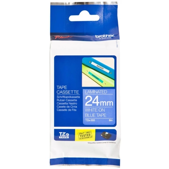 Sikre deg Brother P-Touch Tape TZE-555; hvit på blå, 24mm (8m) for klar og holdbar merking. Passer perfekt til P-Touch 2430 PC, 9700 PC, D 600 VP og mange flere. Sikre deg din i dag!