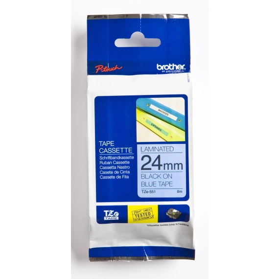 Trenger du holdbare etiketter? Brother P-Touch Tape TZE-551, sort på blå, 24mm x 8m, passer til en rekke P-Touch-modeller inkludert PT-P 900W, E 550W VP. Sikre kvalitet og effektivitet – Kjøp hos oss!