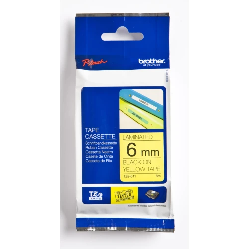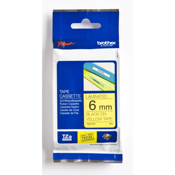 Langvarig effekt? Brother P-Touch Tape TZE-611, sort på gul, 6mm x 8m for nøyaktig merking. Passer til PT-1000, PT-1010, PT-1280 og mer. Oppdag forskjellen.