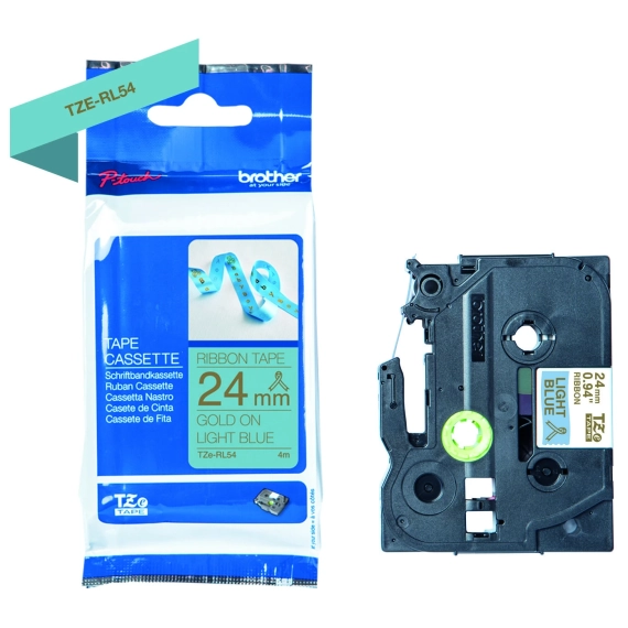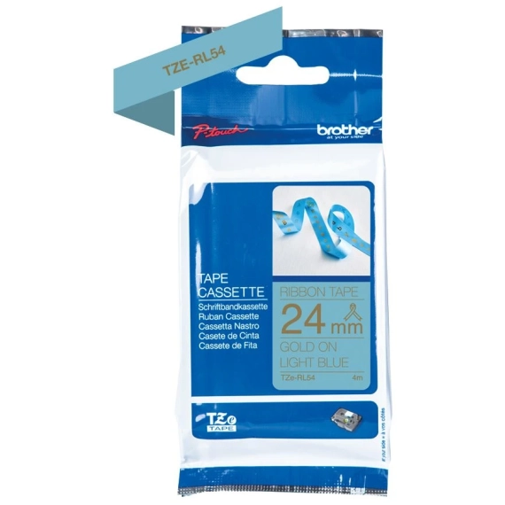 Silkebånd BROTHER TZERL54 i gull på lyseblått i 24 mm bredde som gir deg et raskt og pålitelig resultat, samt en tydelig og profesjonell utskriftsstandard