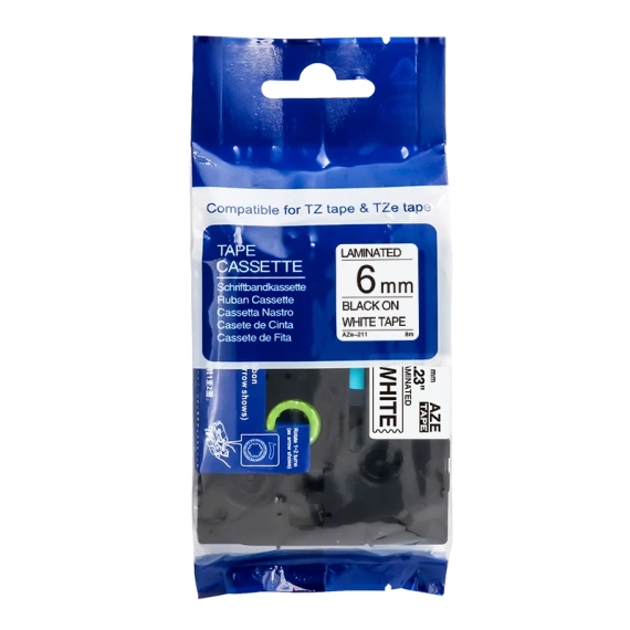 Yaha TZE-211 P-Touch Tape Sort på Hvit 6mm (8m), erstatter Brother TZE-211