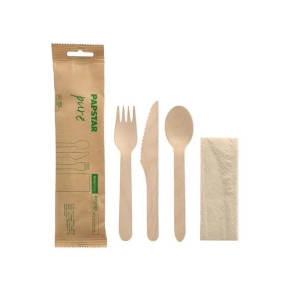 Bestikksett med kniv, gaffel, skje og serviett pakket sammen i en papirpose. Hygienisk løsning for servering og take away. - Materiale bestikk: lyst bjørketre uten belegg - Mål: Kniv 16,5cm, gaffel 15,5cm, skje 15,7cm - Serviett: Papir 23x23cm, 2-lags, 1/8 brettet , brun
