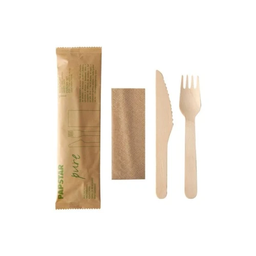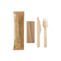 Bestikksett i papirpose med kniv, gaffel og serviett. Hygienisk pakket i en papirpakke. - Bestikksettet består av: - Tregaffel 15,5 cm - Trekniv 16,5 cm - Serviett 23 cm x 23 cm, 2-lags, 1/8 brettet - Farge: naturlig brun - Pakke med 50 stk.