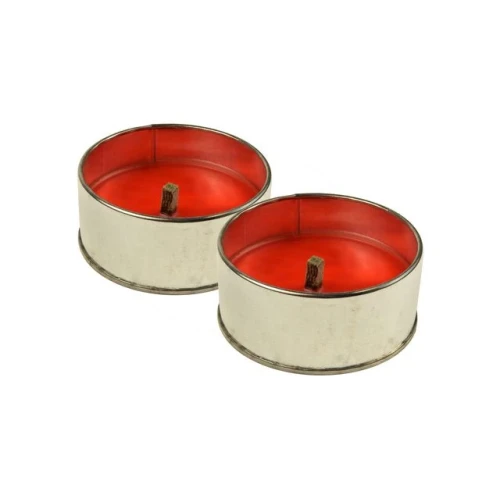 Runde fakkelbokser som brenner i ca. 4 timer. Sølvfarget beholder med rød lys - Diameter: 9 ,9 cm.