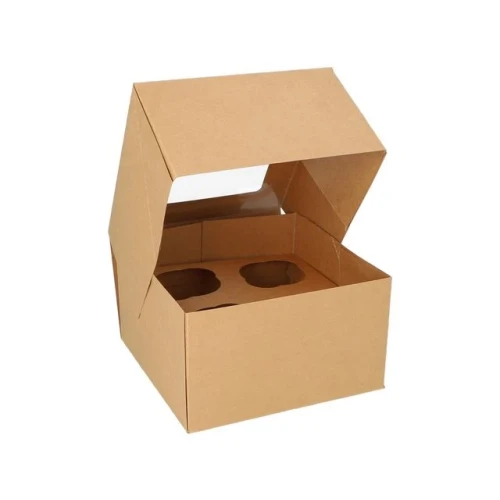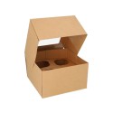 Kakeeske med en praktisk innsats for muffins o.l. Kakeeske for 4 muffins. Esken har hengslet lokk og et vindu i PLA. Med denne esken holdes bakverket stabilt under transport, innlegget forhindrer at muffinsene velter eller skader hverandre. Ideell for bakerier, kafeer og cateringbedrifter som ønsker en praktisk emballasje. Passer også som gaveeske, og når du skal ha med bakverk til feiringer og dugnader. Vinduet i lokket sørger for god synlighet for innholdet, noe som er perfekt for presentasjon og mersalg. Esken kan brukes til oppbevaring og transport, ved maks 40°C. Den er ikke egnet for fryser, stekeovn eller mikrobølgeovn. - Kakeeske med innsats, for 4 muffins el.l - Mål (LxBxH): 17,5x17,5x10cm - Farge: Brun, med vindu - Materiale: Ubelagt papp, vindu i PLA