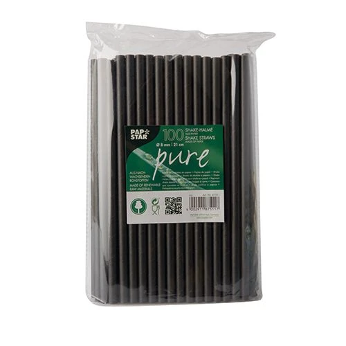 Sugerør i papir basert på biologisk nedbrytbar og fornybare råvarer. Tåler temperatur ved maks. 23 ° C i 60 minutter - Diameter: 8 mm - Lengde: 21 cm - Farge: sort - Pakke med 100 stk.