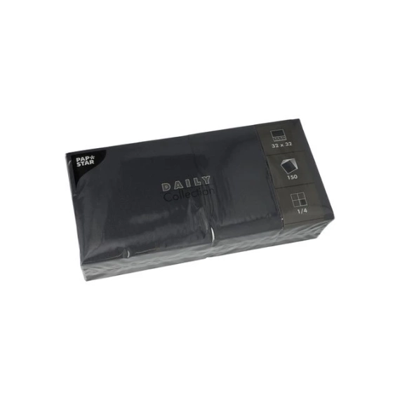 Sorte servietter med tidløst utseende og en behagelig myk følelse. Serviettene består av 2-lags papir. De måler 32x32cm, og er egnet for bretting. Designet er enkelt og tidløst slik at de passer inn i mange ulike borddekorer. Daily servietter leveres i storforpakning og er ideelle for hoteller, restauranter og kantiner, så vel som innen catering. - Myke servietter til hverdagsbruk og oppdekking i hoteller, restauranter, buffeter og kantiner. - Materiale: Papir, 2 lag - Mål utbrettet serviett: 32x32cm, brettet 1/4