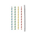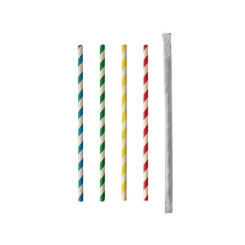 Pappsugerør med stripete dekor og enkeltpakket i hvitt papiromslag.