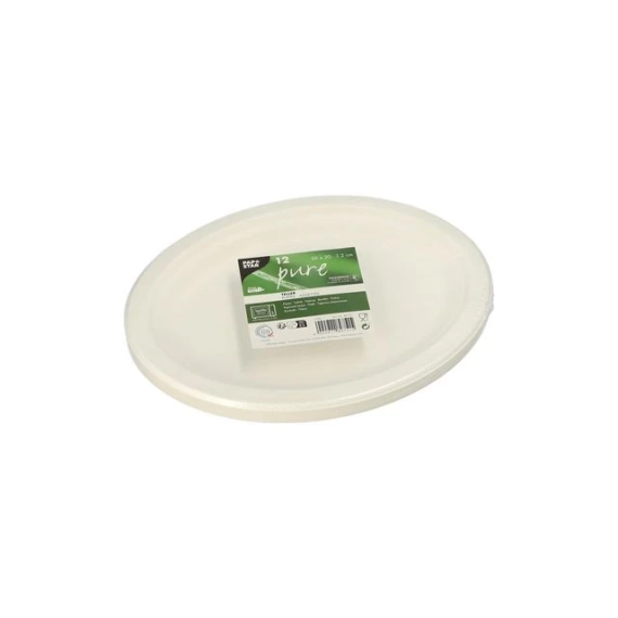 Stabil, hvit tallerken av bagasse med en oval form, fin til borddekking og buffeter. Velegnet for servering av alle typer mat. Tallerkenen tåler temperaturer fra -25°C til +150°C. Den kan benyttes i ovn ved maks 150°C, mikrobølgeovn i inntil 2 min ved 800W, og i fryser. Materialet er basert på en fornybar råvare: overskuddsfiber fra sukkerproduksjon, og produktet inneholder ikke PFAS. Tallerkenen er egnet for hjemmekompostering. - Mål (BxD) 26x20cm - Høyde: 2cm - Farge: Hvit