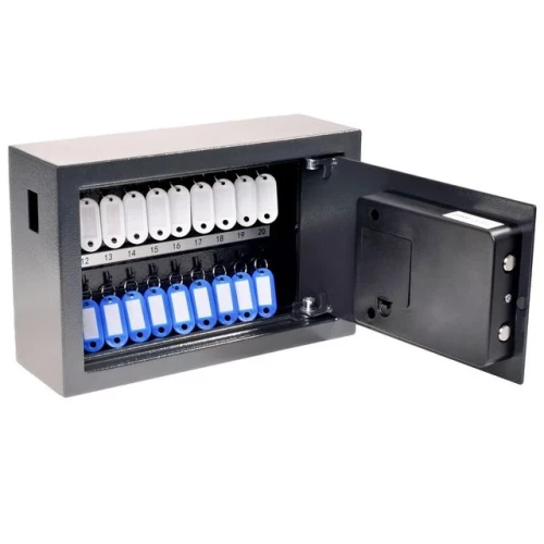 Organiser og sikre nøklene dine med PAVO nøkkelskap for opptil 20 nøkler. PAVO nøkkelskap er en praktisk og sikker løsning for oppbevaring av opptil 20 nøkler. Skapet er laget av robust metall og har nummererte kroker for enkel nøkkelidentifikasjon. Med en elektronisk lås sørger det for sikker oppbevaring av nøklene dine. Perfekt for både kontor og hjem! - Kapasitet: 20 nøkler - Elektronisk lås for ekstra sikkerhet - Slitesterk stålkonstruksjon - Mål: 205x147x347mm - Farge: Mørkegrå