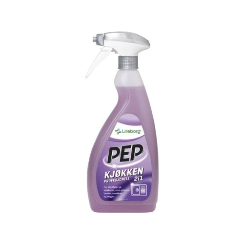 Kjøkkenspray PEP 2i1 er klar til bruk for en enkel og effektiv vask av kjøkkenets overflater. Dette produktet brukes til rengjøring av alle overflater på kjøkkenet som arbeidsbenker, maskiner, vegger etc. - Desinfiserende effekt - Volum: 750ml - pH-verdi: 11 - Fare- og sikkerhetsinformasjon: - H412 Skadelig, med langtidsvirkning, for liv i vann