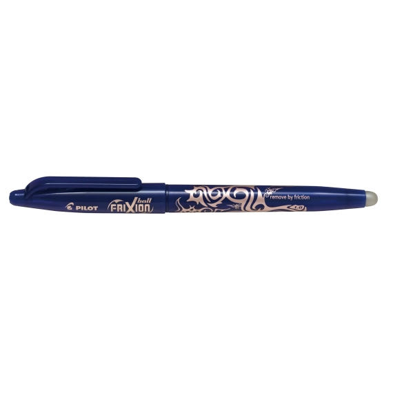 Denne gelpennen bruker varmesensitivt blekk, som kan viskes ut umiddelbart med FriXion-visketuppen som sitter på enden. Pilot FriXion-kulepennen fjerner enkelt feil så mange ganger som nødvendig uten å smitte av eller rive opp papiret. Pennen har en stilig tatoveringsstil på kroppen og et ergonomisk grep med spor som gjør den komfortabel å holde i samt en kule i wolframkarbid.