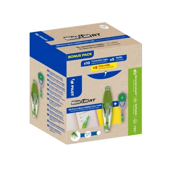 White Line RT er en miljøvennlig, uttrekkbar og refillbar korrekturroller med et moderne design. Den har en nydelig kvalitet som ikke :sprekker eller glipper:. Lengden på båndet er 6m. The Whiteline RT hører til Begreen sortimentet, laget av resirkulert plast. TSammen kan vi gjøre en innsats og bruke forsiktig at verdens resurser. Ved å produsere Begreen White Line RT korrektur system, er Pilot med og reduserer carbon avtrykket på korrekturrolleren i forhold til tilsvarende produkt uten resirkulert plast. Hvis du i tillegg fyller på den mer enn tre ganger med refill, vil du være med å redusere karbonutslippene. Estimater viser at produktets livssyklus gir et redusert fottavtrykk på 72% bare ved å bytte ut refillen 3 ganger eller mer, kontra det å kjøpe en ny penn. En liten gest, som kan gi et stort utslag for miljøet.