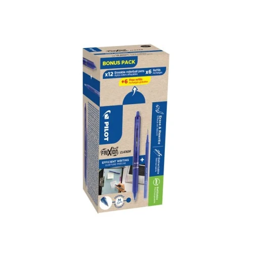 FriXion Ball Clicker gir en unik skriveopplevelse, fjern blekket med friksjon og skriv på nytt igjen. Pilots bestselgende rollerball penn gir deg en ren og fin skrift. Alt dette i en og samme penn! Det er ren magi når man fjerner blekket med hjelp av friksjon/varmen. Det unike gelblekket responderer på varmen når man gnir :viskelæret over. På den måten forsvinner blekket umiddelbart og man skrive på nytt med samme penn. takket være dette patenterte blekket har Pilot nok en gang revulsjonert skriving med denne magiske Frixion ball clicker. Pennen finnes i et uttall av farger, alle kan finne sin favoritt. Spar penger og hjelp miljøet ved å fylle på pennen med refill, i stedet for å kjøpe en ny hver gang den går tom for blekk. Det har rett og slett ikke vært enklere å være miljøvennlig! Den finnes både i 0,5 mm og 0,7 mm, det vil si at den har en strekbredde på 0,25 og 0,35 mm. På grunn av det fjernbare blekket, er ikke dette en penn å signere dokumenter med, eller andre dokumenter som skal være permanente også i framtiden.