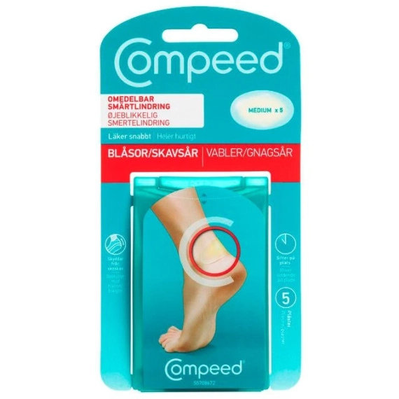 Compeeds mellomstore gnagsårplaster absorberer overflødig fuktighet og danner en beskyttelsespute som gir umiddelbar smertelindring og optimale forhold for leging av gnagsår på føtter. Hydrokolloid-teknologi er en aktiv gelé med fuktighetsabsorberende partikler. Compeed har avrundet kant, slik at det ligger jevnt på hudens overflate. Dette reduserer friksjon og gjør at helingsprosessen ikke avbrytes av smertefull gnisning. - Inneholder 5 plaster. - Holder seg på plass i flere dager. - Gjennomsiktige kanter. - Formtilpasset. Vanntett. - Pustende. - Holder naturlig fuktighet inne og smitte ute. - Størrelse pr plaster: (LxH): 6,8x4,2 cm.
