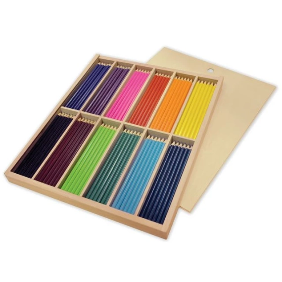Blanding av perler i fine farger oppbevart i en praktisk bøtte. Stor pakke med mange fargeblyanter i nydelige farger. Dette settet inneholder 216 smale fargeblyanter i ulike farger, perfekt til å tegne, fargelegge bøker og fargelegge f.eks. Blyantene er i en praktisk, låsbar treboks som gjør det enkelt å se alle fargene og holde orden. - Antall: 216 stk, 18 av hver farge. - Mål: Lengde: 40cm, Bredde: 32cm Høyde: 4,2cm - Pennstørrelse: - Lengde: 17,5cm, Ø 0,7cm - Materiale: Polert tre - Farge: 12 forskjellige farger