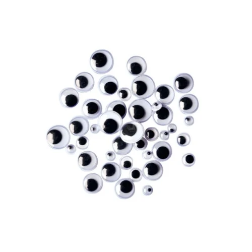 Svarte og hvite øyne med bevegelige pupiller i tre forskjellige størrelser Svarte og hvite øyne med bevegelige pupiller i tre forskjellige størrelser. Disse øynene kalles også goggly eyes og kan brukes til masse håndverk der man ønsker å lage ansikter. - Antall: 300 stk - Mål: Ø 7, 10 & 15mm - Farge: Svart/Hvit - Materiale: PET