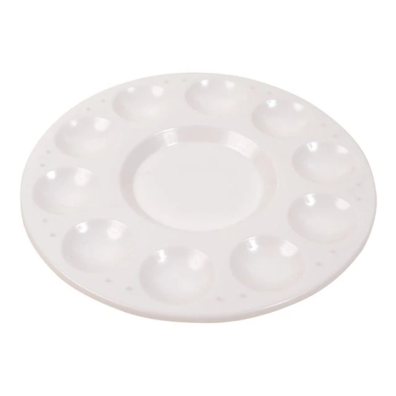 Rund fargepalett som kan fylles med våre akryl- eller oljemaling Rund og Praktisk fargepalett som kan fylles med våre akryl- eller oljemaling. Paletten er lett å vaske ut og har lang levetid. - Emballasje med 10 stk - Mål: Ø: 17cm, Høyde: 7,7mm - Antall rom: 10 små ca Ø 3mm, 1 stor Ø 75mm