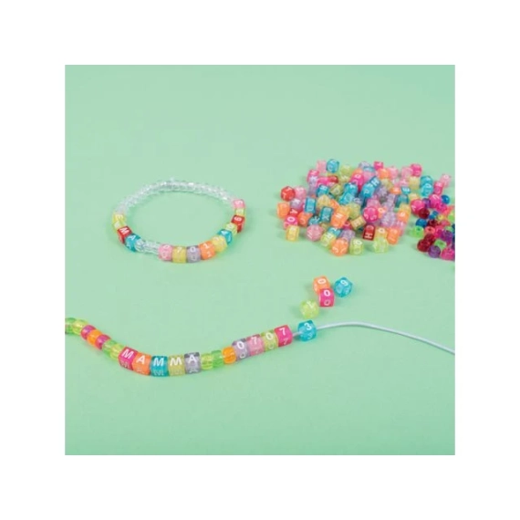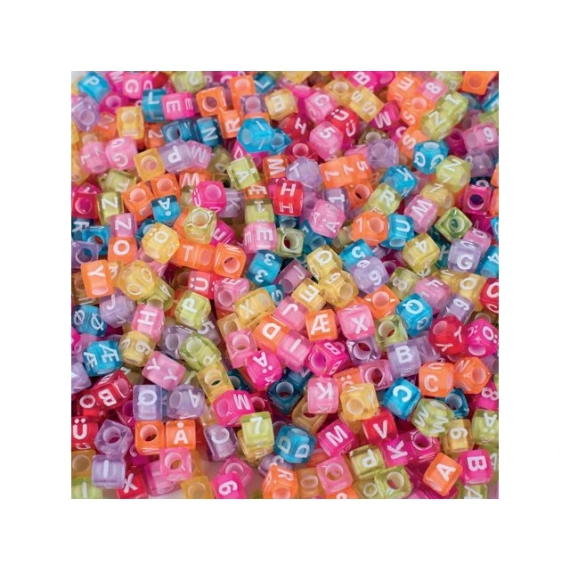 Bokstav- og tallperler i fine farger. Fargeperlene inspirerer til gledespredende kreasjoner. La fantasien løpe løpsk og lag dine egne kule armbånd og halskjeder med bokstavperler. Bokstavperler er en perfekt aktivitet for barn som lærer å skrive, lese og telle mens de har det gøy. Perleblandingen inneholder bokstavene A-Ö, Æ, Ü samt symbolene # og ?. - Antall: 1000 stk, - Mål: 6 x 6 x 6mm - Hulldiameter: 3,5mm - Farge: Gul, Oransje, Rød, Cerise, Rosa, Lilla, Blå & Grønn - Materiale: PMMA