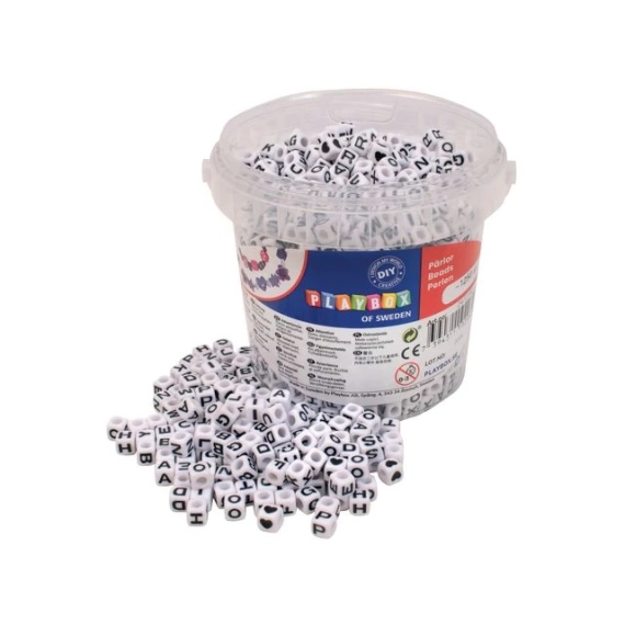 Hvite bokstavperler med svart tekst i bøtte, ca 1250 stk perler. - Perlenes mål 6,5 x 6,5 mm