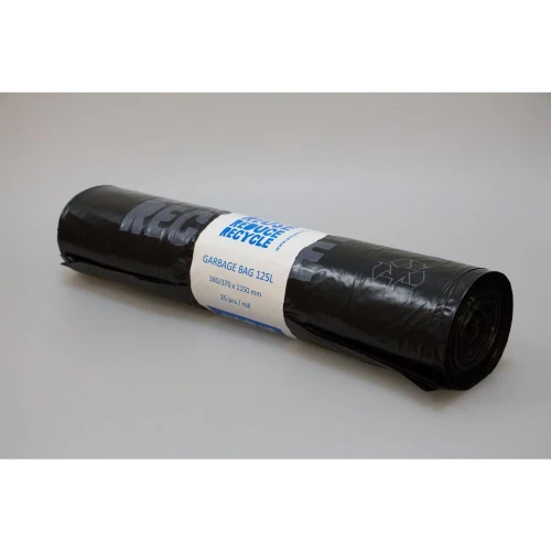 PolyBlue avfallssekk 125L. Produsert av 100% gjennvunnet LDPE. - Blue Angel sertifisert - Tykkelse: 40my - Rull med 25 stk.
