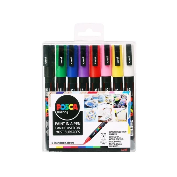 Vannbasert permanent malingsmerkepenn. Skriver på papir, kort, metall, glass, stoff og de fleste andre overflater. Blekket trekker ikke gjennom papiret. - 0,9-1,3mm spiss - Rist pennen (kulene på innsiden skal høres), og trykk spissen mot en prøvebit til blekket begynner å komme. - Slipp opp trykket for å unngå oversvømmelse. - Inneholder fargene: sort, blå, rød, grønn, gul, lilla, rosa og hvit.