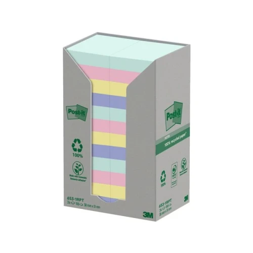 Post-it® Recycled Notes er laget av 100% resirkulert papir og et fornybart klebestoff, 60% laget av planter som vokser opp igjen årlig. De er sertifisert PEFC resirkulert, hentet fra sertifiserte, fornybare og ansvarlig styrte skoger.