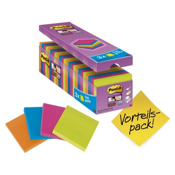 Post-it® superklister-lapper er forsynt med et sterkt klebemiddel, slik at de sitter bedre fast på ulike overflater enn de fleste andre klistrelapper. Sørg for at notatene eller ideene dine blir lagt merke til med disse Post-it® Super Sticky Notes i Canary Yellow?. Disse superklebende klistrelappene er laget av PEFC?-sertifiserte papirfibre, og er et miljøbevisst valg som dekker alle notatbehov. I tillegg har de et ekstra sterkt klebemiddel som er laget av 60 % fornybare ressurser. Post-it®-lapper er svært allsidige, slik at du kan bruke dem til ulike formål, for eksempel raskt å skrive ned telefonnumre, lage oppgavelister eller notere ideer og legge igjen beskjeder til kolleger, venner eller familie. Lappene kan flyttes, slik at du enkelt kan feste, fjerne og plassere dem på nytt uten at de etterlater seg limrester på overflater som arkivskap, dører og vegger eller inne i almanakker, ringpermer eller journaler. Hver blokk på 76 x 76 mm har 90 Super Sticky-ark. De leveres i pakker på 24 blokker med 4 forskjellige sterke farger som gjør at ideene dine og lappene skiller seg ut. - Sterkere lim som sitter bedre - Laget med PEFC?-sertifiserte papirfibre - Klebemiddel laget av 60 % fornybare ressurser - Ideelle for å ta imot telefonbeskjeder eller raskt skrive ned notater og påminnelser - Godt egnet for merking av sider eller for å legge inn notater i bøker eller tidsskrifter - De sterke fargene gjør at beskjedene synes godt - Ligger alltid flatt, bøyes og krølles ikke - Hver blokk inneholder 90 ark - Størrelse: 76 x 76 mm - Assorterte farger - Pakke med 24 blokker