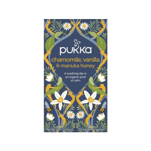 Pukka te med gylden, silkeaktig kamille, søt vaniljestang og deilig manuka honning. En deilig kopp te som både gir deg ro og sødme. - Økologisk. - Inneholder 20 teposer. - Koffeinfri: ja. - Trekketid: Inntil 15 minutter. - Nettovekt: 32g.