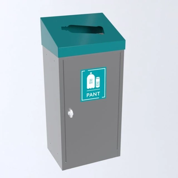 En komplett avfallsbeholder på hjul/fotskruer i pulverlakkert stål med dør. Toppen er med flaskeutsparring og lakkert i fargen turkisblå, samme farge som påsatt etikett pant. Avfallsbeholderen har en innvendig sekkeholder. Kan monteres sammen i miljøstasjoner. - Volum: 60L