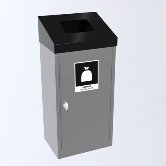 En komplett avfallsbeholder på hjul/fotskruer i pulverlakkert stål med dør. Toppen er lakkert sort, samme farge som påsatt etikett restavfall. Avfallsbeholderen har en innvendig sekkeholder. Kan monteres sammen i miljøstasjoner. - Volum: 60L