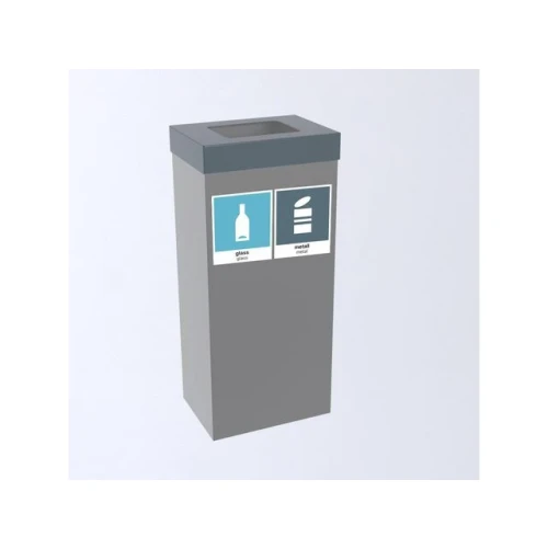En komplett stål avfallsbeholder på hjul, lakkert grå. Med grå topp og etiketter for glass og metall. Innvendig plastbakke i bunn. Inklusive koblingsbraketter for enkelt å montere flere beholdere sammen til miljøstasjoner. - Volum: 35L
