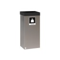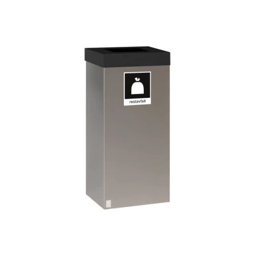 En komplett stål avfallsbeholder på hjul, lakkert grå. Med sort topp, ferdig merket med sort etikett for restavfall. Innvendig plastbakke i bunn. Inklusive koblingsbraketter for enkelt å montere flere beholdere sammen til miljøstasjoner. - Volum: 35L