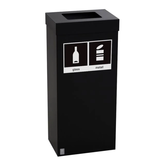 En komplett avfallsbeholder på hjul, topp og beholder lakket i RAL7021 SHR lakk, påsatt svart/hvit etiketter for glass + metall. Innvendig plastbakke i bunn. Inklusive koblingsbraketter for å montere flere beholdere sammen til miljøstasjoner. - Volum: 65L