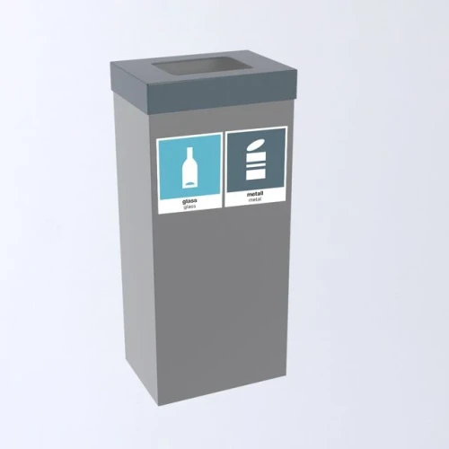 En komplett avfallsbeholder på hjul lakkert grå, med lysegrå topp, ferdig merket med etiketter for glass+metall. Innvendig plastbakke i bunn. Inklusive koblingsbraketter for å montere flere beholdere sammen til miljøstasjoner. - Volum: 65L