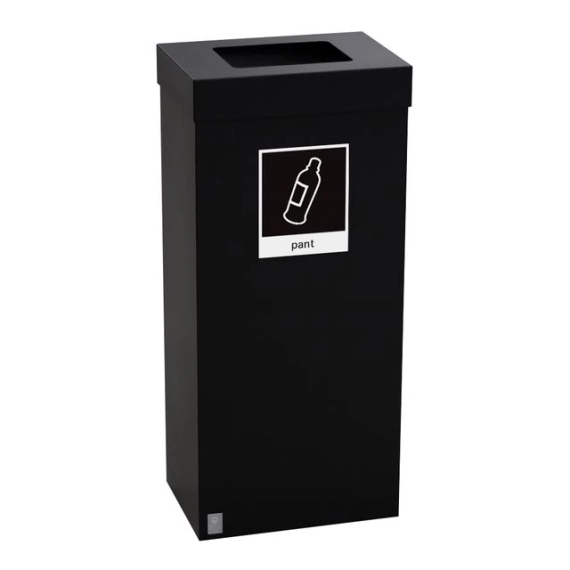 En komplett avfallsbeholder på hjul, flasketopp og beholder lakket i RAL7021 SHR lakk, påsatt svart/hvit etiketter for pant. Innvendig plastbakke i bunn. Inklusive koblingsbraketter for å montere flere beholdere sammen til miljøstasjoner. - Volum: 65L