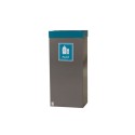 En komplett avfallsbeholder på hjul lakkert grå med turkisblå flasketopp, merket med etikett PANT i front. Innvendig plastbakke i bunn. Inklusive koblingsbraketter for å montere flere beholdere sammen til miljøstasjoner. - Volum: 65L