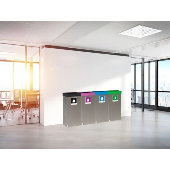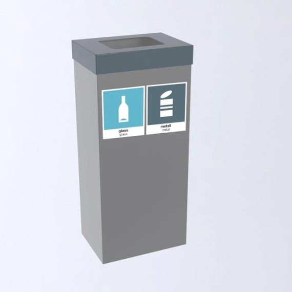 En komplett avfallsbeholder på hjul lakkert grå, med lusgrå topp, ferdig merket med grå og turkise etiketter for metall + glass. Innvendig plastbakke i bunn. Inklusive koblingsbraketter for å montere flere beholdere sammen til miljøstasjoner. - Volum: 90L